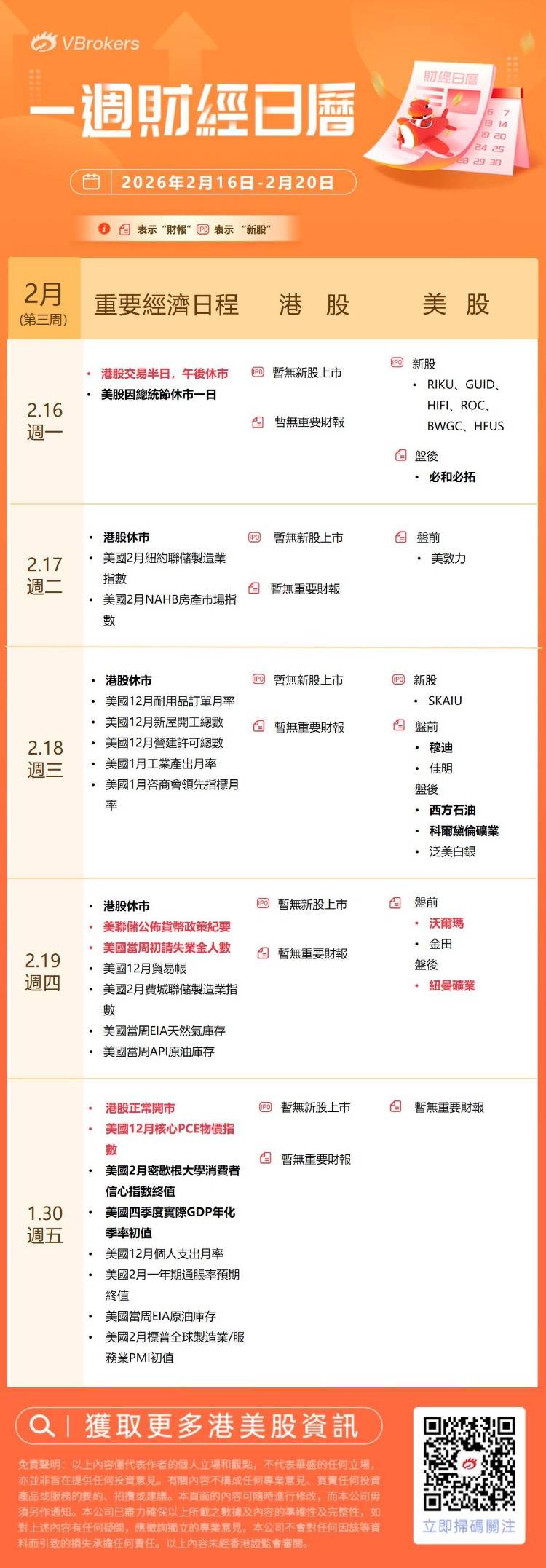 展望下週,港美市場將進入“春節+總統日”雙假期模式,交易時間將明顯減少:美股2月16日週一將因總統日休市,2月17日恢復交易。週四,美國將公佈當週初請失業金人數;週五,投資者可關注核心PCE物價指數及密歇根大學消費者信心指數。