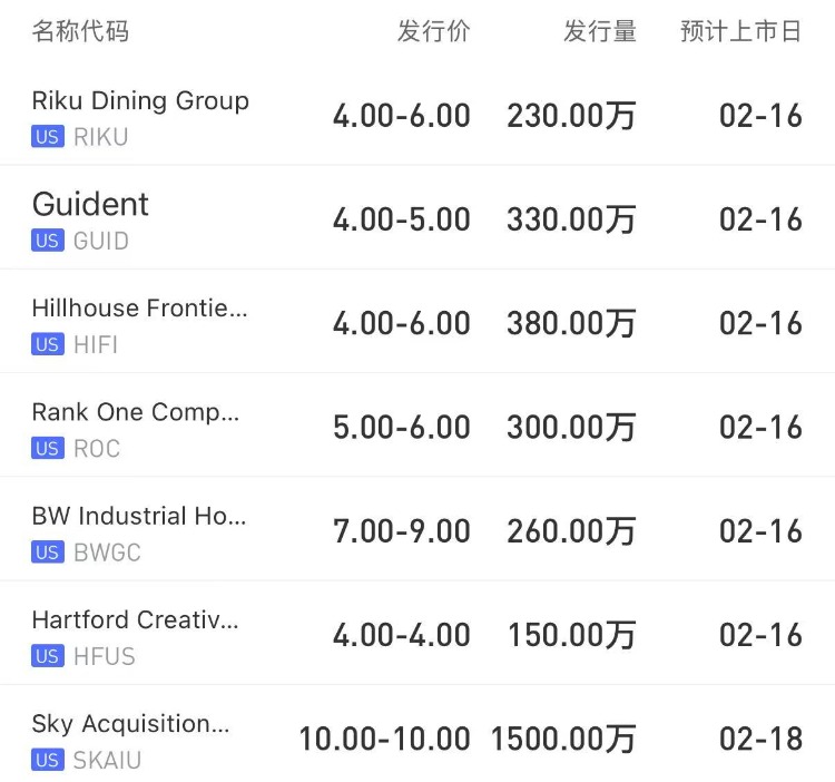 下週無港股新股;美股方面預計有7只新股上市,可關注建築服務供應商公司BW Industrial Holdings、豪華汽車出口商Hillhouse Frontier Holdings。