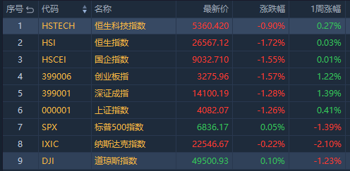 港股方面,本週恒生指數漲幅0.03%,報26567.12點;恒生科技指數漲幅0.27%,報5360.42點;國企指數漲幅0.01%,報9032.71點。