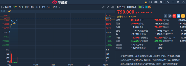 華盛資訊2月16日訊,三隻獲恒指新納入的成分股盤中走強,洛陽鉬業、老鋪黃金漲約7%,寧德時代漲近3%。