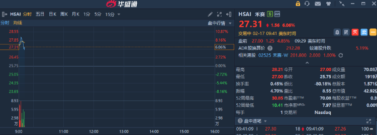 禾賽盤初一度大漲超9%,現漲約6%;據報宇樹兩款人形機器人搭載禾賽旗下激光雷達。