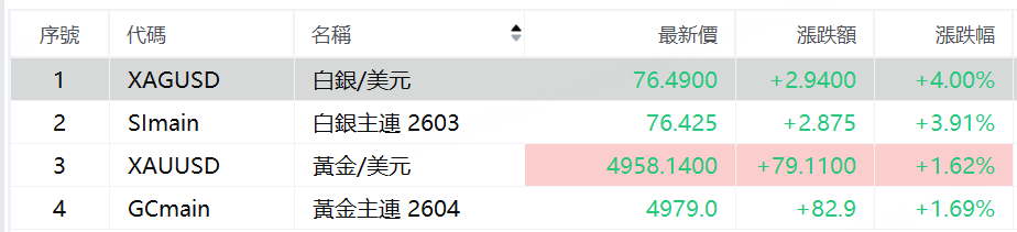 現貨白銀升幅擴大至4%,現貨黃金向上突破4950美元;概念股泛美白銀盤前升逾2%,紐曼礦業盤前升逾1%。 2倍做多白銀ETF-ProShares (AGQ)盤前升8%, 2倍做多黃金ETF-ProShares (UGL)升3%。