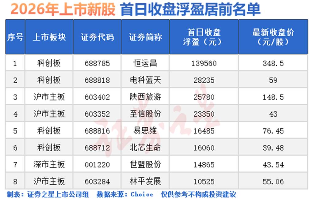 登錄科創板的恆運昌(688785)首日收盤浮盈高達13.96萬元,在年內新股中遙遙領先;登陸科創板的電科藍天(688818)首日收盤浮盈達2.82萬元,排名第二;登陸主板的陝西旅遊(603402)首日收盤浮盈達2.58萬元;登陸主板的至信股份(603352)首日收盤浮盈達2.34萬元。此外,易思維、北芯生命、世盟股份、林平發展等4只新股首日收盤浮盈也在1萬元以上。具體名單如下: