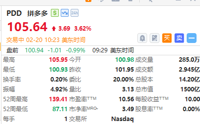 華盛資訊2月20日訊,拼多多大漲近4%,Q4獲多家中國頂流私募集體加倉;
