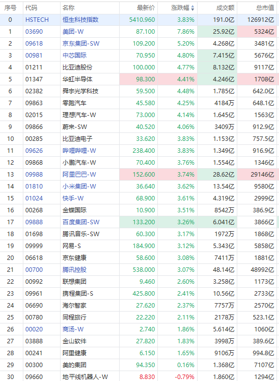 科網股普大漲,美團-W漲近8%,京東集團-SW漲超5%,阿里巴巴漲近4%,網易-S、騰訊控股、快手-W漲超3%。