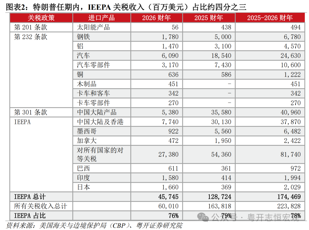 IEEPA關稅實施時間較早,實施以來產生的關稅收入佔比較高。基於美國海關與邊境保護局(CBP)數據,我們測算,2025財年以來(2024年10月至2025年12月),美國累計徵收關稅超2200億美元,其中IEEPA關稅超1700億美元,佔比達78%。這也意味着,若全額退稅,將抹去特朗普第二任期內約四分之三的新增關稅收入。