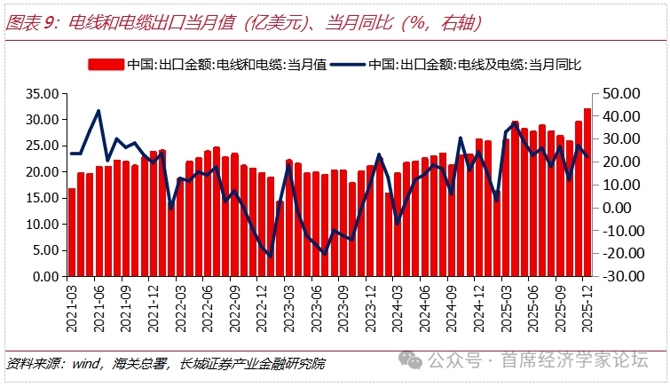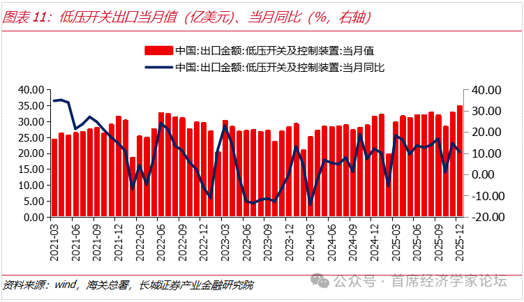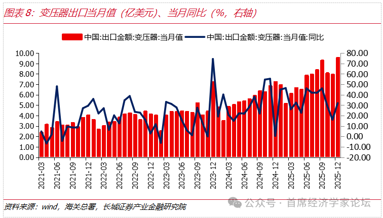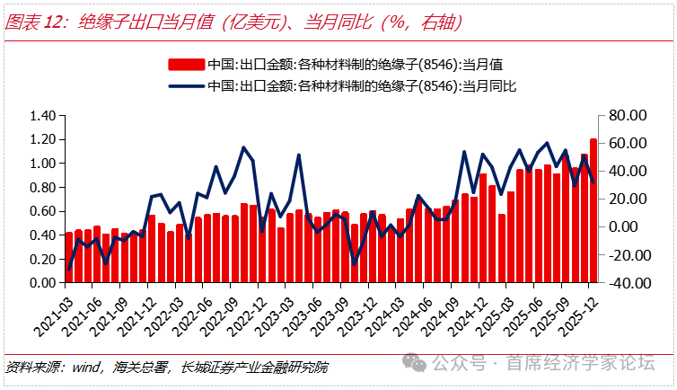 中國電網設備企業在全球供應鏈、技術和成本等方面具有綜合優勢。根據海關總署數據,2025年全年變壓器累計出口金額爲90.36億美元,累計增速34.83%,金額創歷史新高。2025年12月重點電力設備出口產品中,變壓器、電線電纜、銅製繞組電線、低壓開關、絕緣子的出口金額當月同比分別爲31.92%、22.20%、11.71%、10.60%、31.91%,呈現出多品種高增長態勢,單月出口金額呈上升趨勢。2026年,在國內外需求的多重因素拉動下,電網設備重點產品出口均有望延續向好格局。