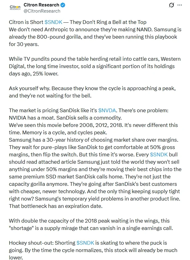 打個比方:做空$SNDK就像是滑向冰球運動的終點。等到市場週期恢復正常時,這支股票的價格已經跌得更低了。