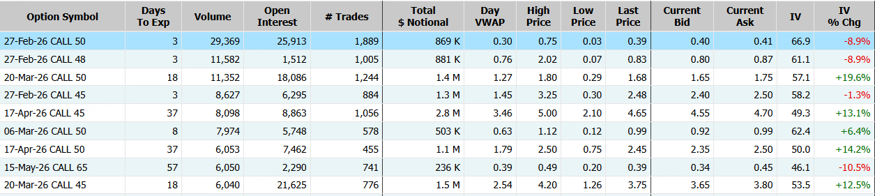 PayPal隔夜漲超6%,期權合約成交29.52萬張,較90日均量放大1.8倍。2月27日到期的50美元的行權看漲期權交易量特別高,共有29,369份合約交易。 $PYPL 20260227 50.0 CALL$