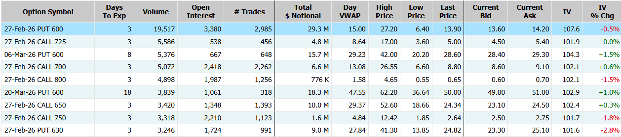 閃迪隔夜跌超4%,期權合約成交20萬張,較90日均量放大2.3倍。2月27日到期的600美元的行權看跌期權交易量特別高,共有19,517份合約交易。 $SNDK 20260227 600.0 PUT$