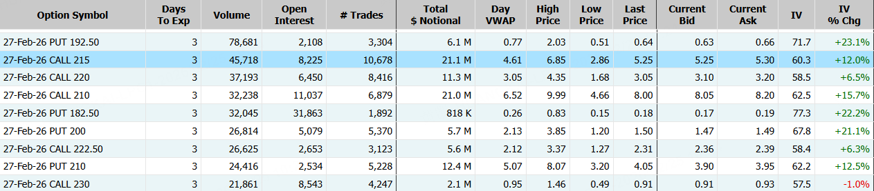 美國超微公司隔夜漲超8%,期權合約成交108.91萬張,2月27日到期的215美元的行權看漲期權交易量特別高,共有45,718份合約交易。 $AMD 20260227 215.0 CALL$