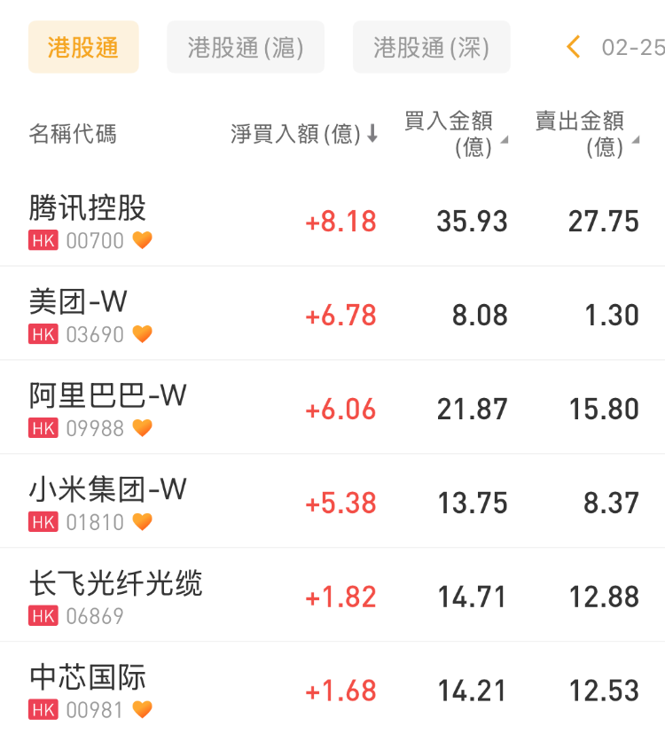 騰訊控股、美團-W、阿里巴巴-W分別獲淨買入8.18億港元、6.78億港元、6.06億港元;