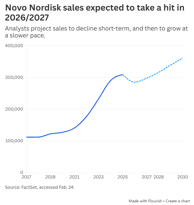本月早些時候,諾和諾德表示,預計2026年銷售額和利潤將下降5%至13%。如果這一預測成真,那將是以本幣計算,自2017年以來首次出現年度銷售額下滑。