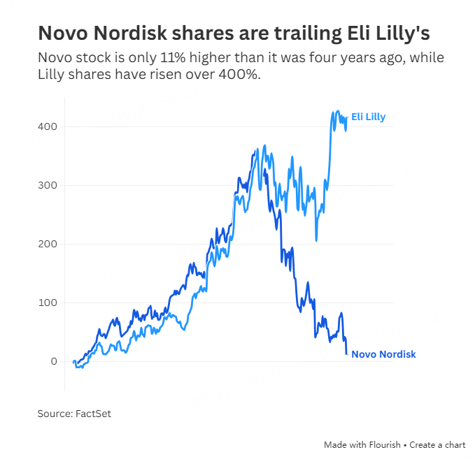 儘管率先推出了用於減肥的GLP-1藥物,但諾和諾德的市場份額已被侵蝕。根據大多數估計,該公司目前僅佔據約40%的市場份額,而其競爭對手禮來公司則佔據了60%。