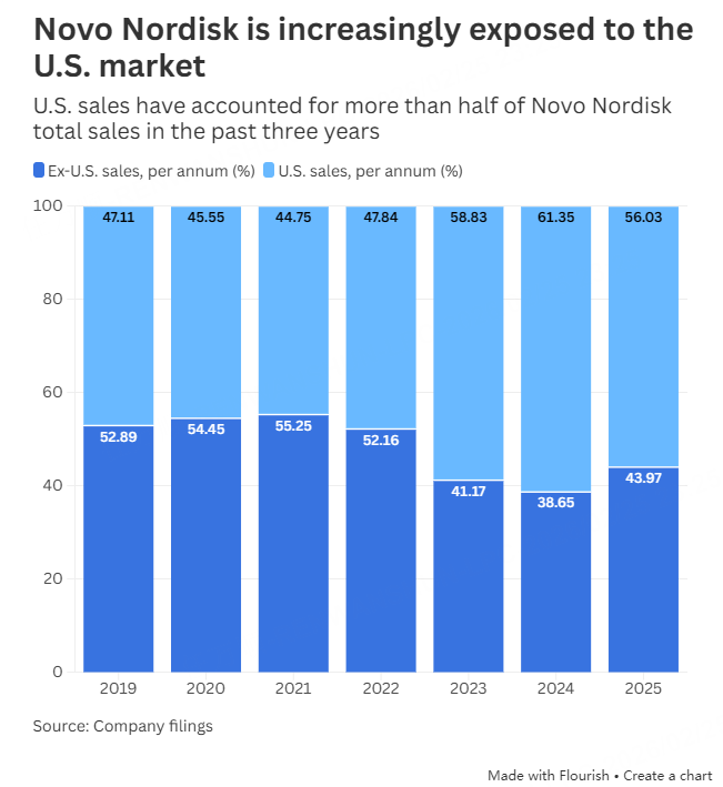自2023年以來,美國市場一直佔諾和諾德總銷售額的一半以上,該地區的價格下跌正拖累公司的營收和盈利能力。去年,諾和諾德和禮來公司與特朗普政府達成協議,降低其在聯邦醫療保險和醫療補助計劃中的GLP-1藥物價格,並以折扣價直接向消費者提供這些治療藥物。