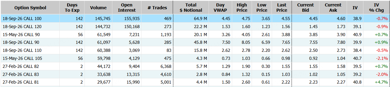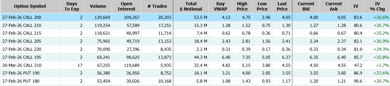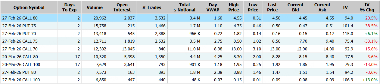 “穩定幣第一股” Circle隔夜暴漲35%,期權合約成交46.35萬張,較90日均量放大4.2倍。2月27日到期的80美元的行權看漲期權交易量特別高,共有20,962份合約交易。 $CRCL 20260227 80.0 CALL$