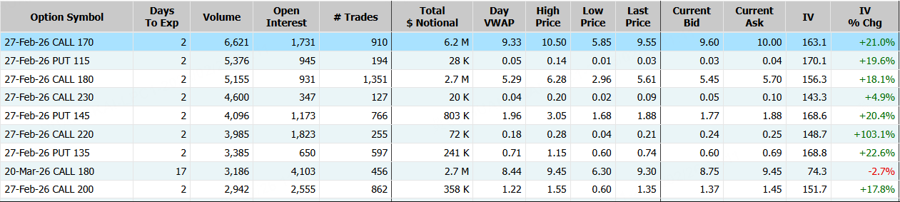 Snowflake隔夜漲超5%,期權合約成交13.9萬張,較90日均量放大2.7倍。2月27日到期的170美元的行權看漲期權交易量特別高,共有6,621份合約交易。 $SNOW 20260227 170.0 CALL$