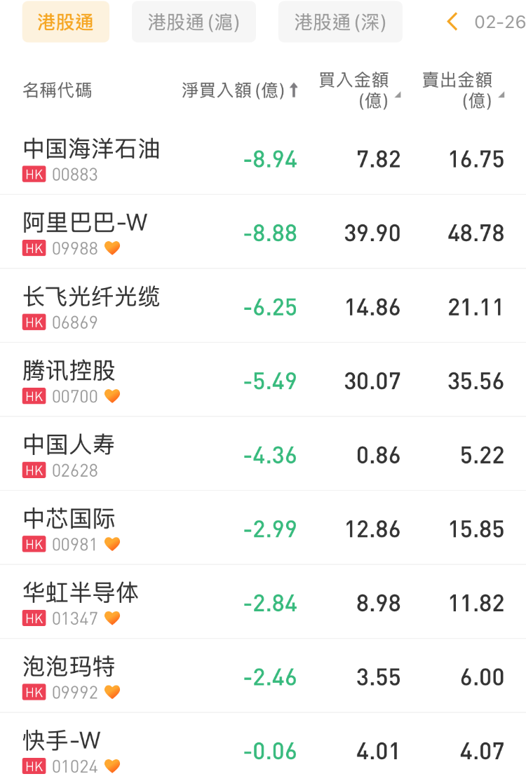 中國海洋石油、阿里巴巴-W、長飛光纖光纜分別遭淨賣出8.94億港元、8.88億港元、6.25億港元。