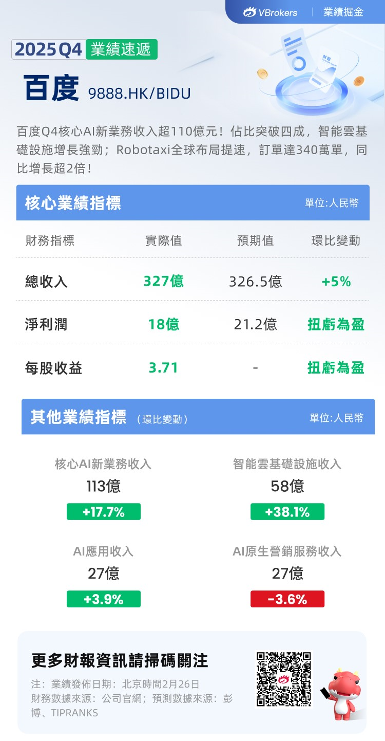 華盛資訊2月26日消息,百度 $09888.HK / $BIDU 今日公佈截至2025年12月31日止的第四季度業績。
