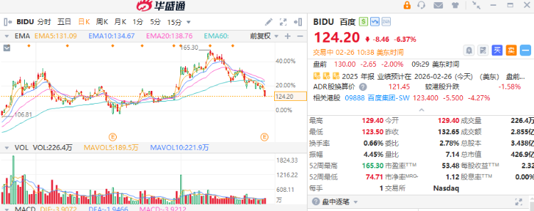 華盛資訊2月26日訊,美伊談判情緒緊繃,美股三大指數早盤大幅跳水,納指跌超2%;中概股隨大市下挫,百度績後大跌逾6%。