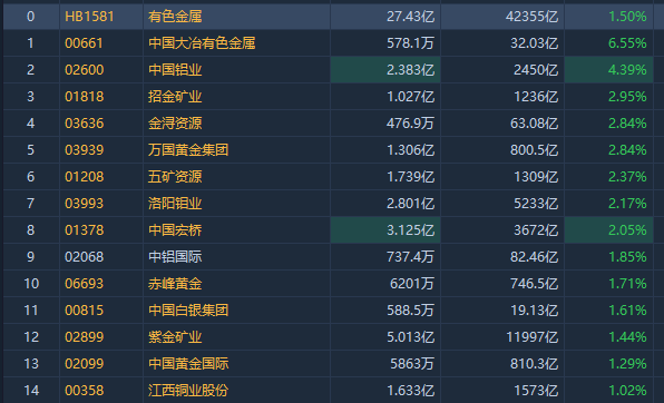 華盛資訊2月27日訊,有色金屬概念集體走高,中國鋁業漲超4%,招金礦業漲近2%,金潯資源、萬國黃金、五礦資源、洛陽鉬業、中國宏橋漲超2%。