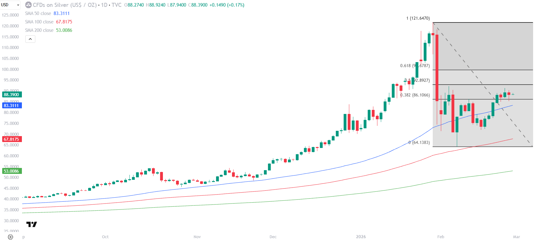 然而,拋物線式上揚往往難以持久。銀價在見頂後迅速回吐,短短七個交易日內大幅下挫近五成,低見63.9美元,波幅之大同樣驚人。其後銀價自低位逐步反彈,經歷約一個月反覆回升,目前已收復約一半前期跌幅,現價大致於上一輪跌幅的38.2%至50.0%黃金比率區間徘徊整固(圖1),技術上屬關鍵阻力區域。