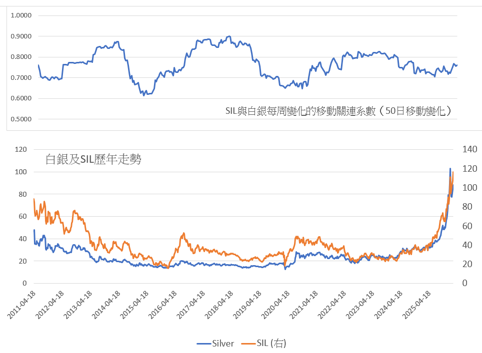 目前在美國上市、市值最大的白銀礦股ETF——Global X Silver Miners ETF(SIL),其走勢長期與銀價高度相關。回顧歷史數據,兩者大部分時間呈現亦步亦趨的關係;若計算兩者每週變動的50日移動相關係數,數值多數維持在0.6甚至以上(圖2),顯示關聯性相當顯着。換言之,SIL在某程度上具備“前瞻指標”的功能,其走勢往往可爲銀價提供啓示。