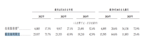 進一步研究發現,公司研發開支的內部結構發生變化。公司的員工福利開支逐年下滑,由2022年的0.26億元降至2024年的0.19億元,佔研發開支的比例由73.7%下滑至42.9%。2025年前三季度,該金額爲0.12億元,同比下滑24%,佔比由2024年同期的64.6%降至25.4%。