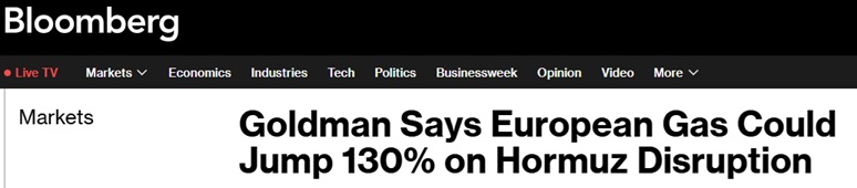 高盛分析師表示:「如果通過霍爾木茲海峽的天然氣供應運輸中斷時間超過兩個月,歐洲天然氣價格可能升至每兆瓦時100歐元以上(約合35美元/百萬英熱單位),從而引發更爲顯著的全球天然氣需求破壞。」