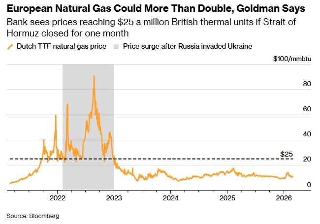 #伊朗危機追蹤#FX168財經報社(亞太)訊 高盛集團(Goldman Sachs Group Inc.)表示,如果霍爾木茲海峽的航運中斷一個月,歐洲天然氣價格可能上漲至原來的兩倍以上。