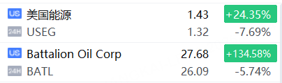 部分油氣股回落,美國能源跌超7%,Battalion Oil跌超8%。