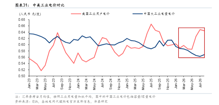 更值得關注的是中美工業電價的倒掛。2025年下半年以來,中美批發側和零售側電價先後出現倒掛,美國氣價上漲推動電價上行,中國煤價回落則帶動電價下行。根據華泰證券測算,2026年中國大工業綜合電價將明顯低於美國,這種“剪刀差”本質上是兩國一次能源價格分化的結果——中國煤價回落與美國氣價上漲形成了鮮明對比。