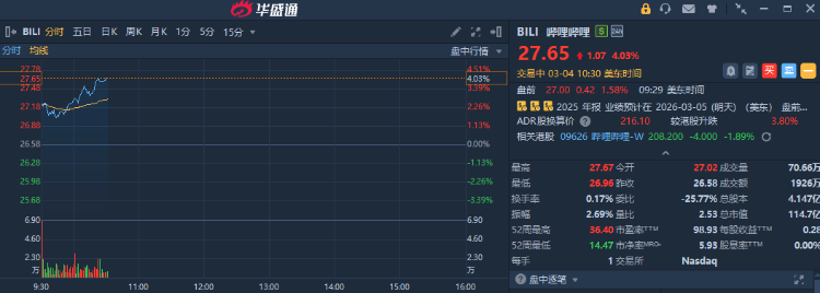 華盛資訊3月4日訊,中概股盤中普漲,嗶哩嗶哩漲超4%,網易、拼多多漲超1%。