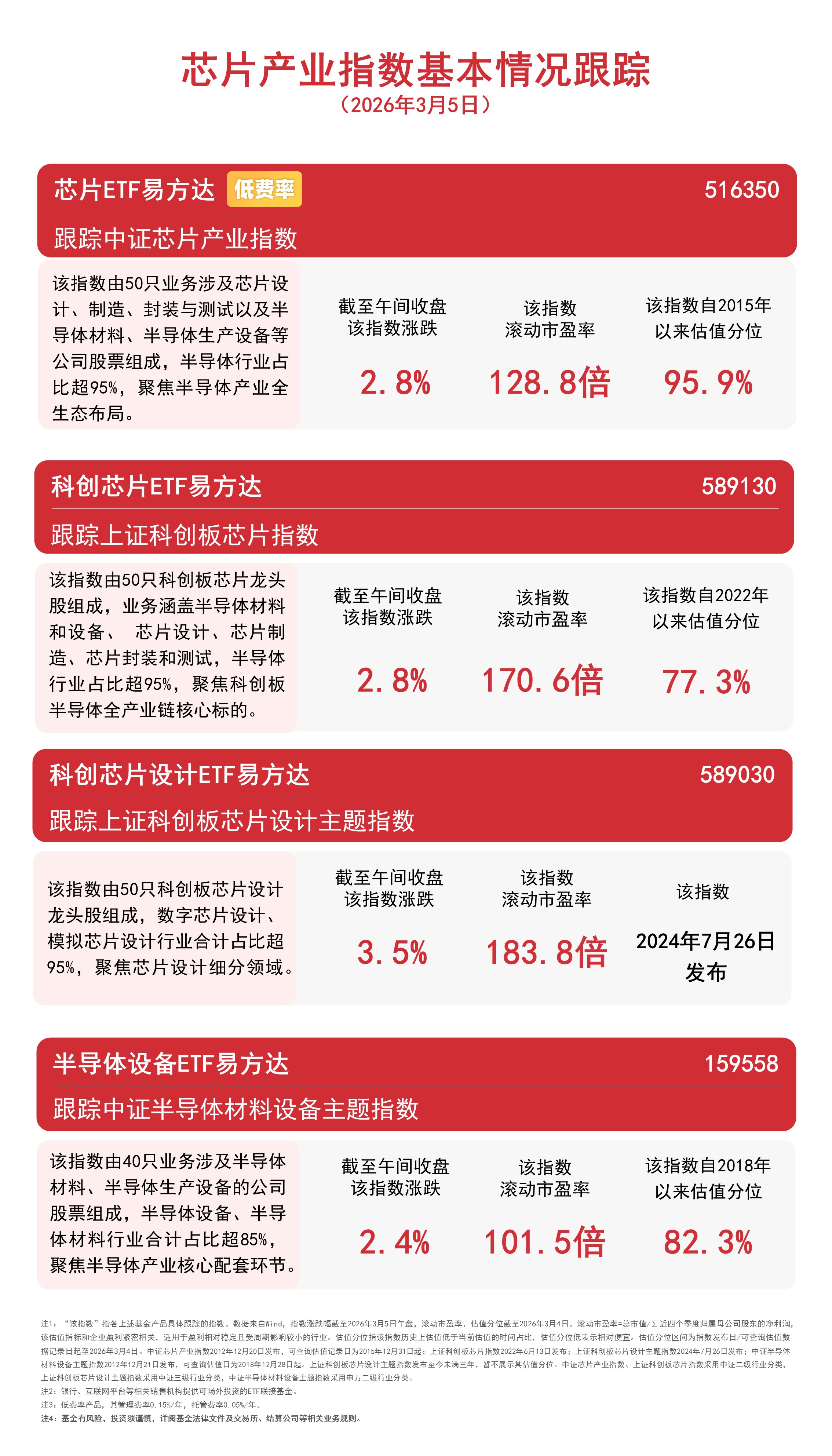 3月5日早盤,市場震盪反彈,芯片產業鏈全線走強。截至午間收盤,上證科創板芯片設計主題指數上漲3.5%,中證芯片產業指數、上證科創板芯片指數均上漲2.8%,中證半導體材料設備主題指數上漲2.4%。Wind數據顯示,科創芯片設計ETF易方達(589030)和半導體設備ETF易方達(159558)近兩個交易日均獲約1億元資金淨流入。