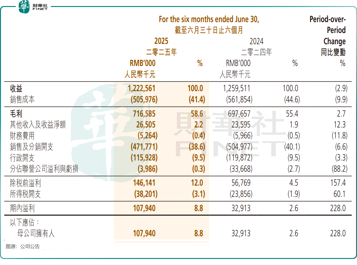 周黑鴨大刀闊斧的改革成效已逐步顯現,於2025年上半年,周黑鴨毛利率從上年同期的55.4%提升至58.6%,淨利潤率從2.6%飆升至8.8%,母公司擁有人應占溢利同比增長228%;銷售及分銷開支同比減少6.6%,行政開支下降3.3%,成本端有所收窄。