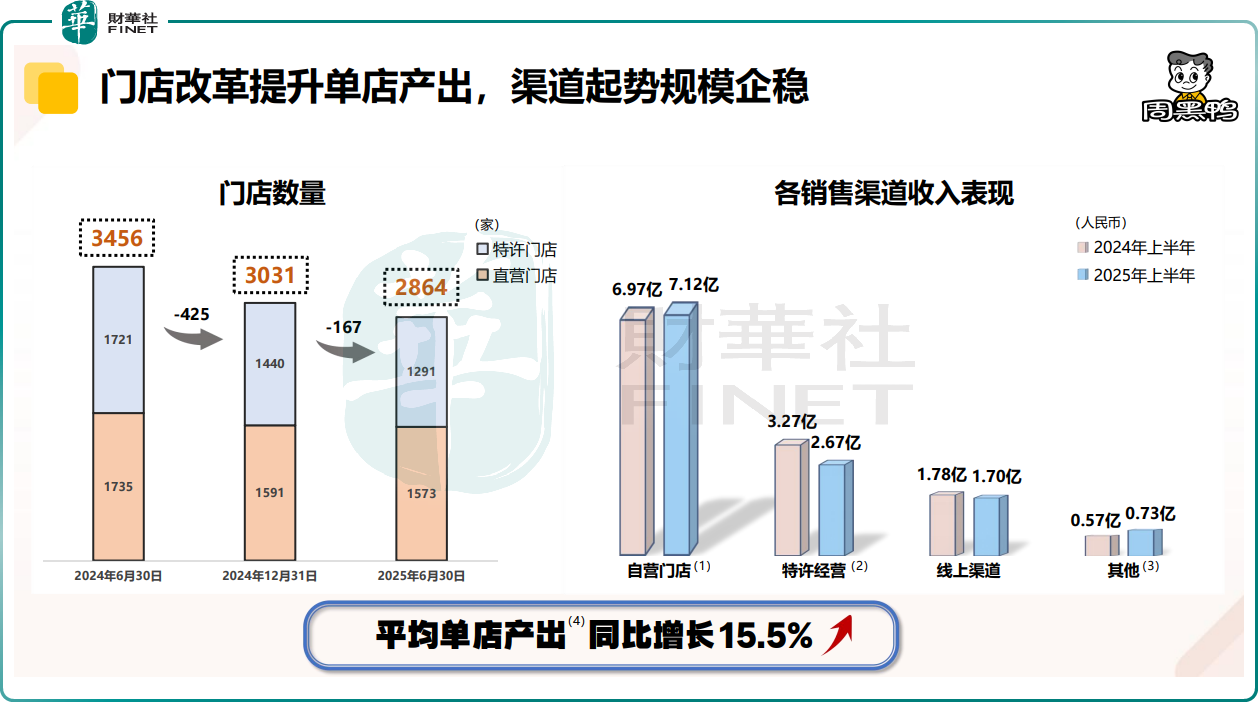 首先是門店策略的調整。公司對現有門店進行梳理,砍掉低效店鋪:2024年淨減少785家,2025年上半年再淨減少167家,門店總數從峰值回落至2025年6月末的2864家。