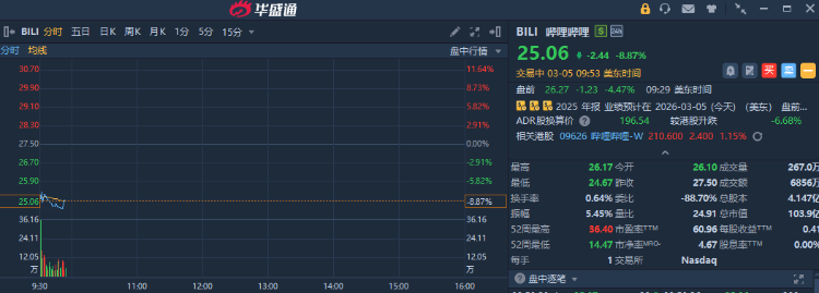 華盛資訊3月5日訊,熱門中概股盤中普跌,嗶哩嗶哩一度重挫超10%,現跌近9%;公司Q4營收同比增長8%,經調整淨利潤增94%。