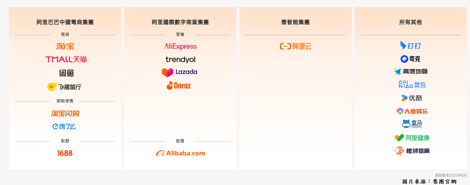 首先講現時的情況,阿里早已由單一電商,發展成橫跨本地電商、國際電商、雲智能、物流、外賣、娛樂的綜合生態。