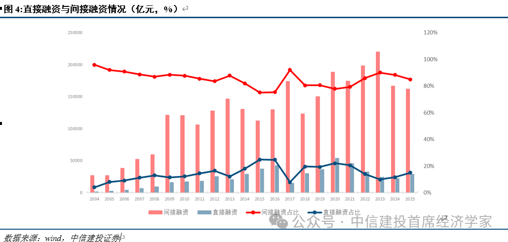 資本市場發展方面,報告指出,要持續深化資本市場投融資綜合改革,進一步健全中長期資金入市機制,完善投資者保護制度,拓展私募股權和創投基金退出渠道,提高直接融資、股權融資比重。對比2025年報告中,在貨幣政策部分提出“優化和創新結構性貨幣政策工具,更大力度促進樓市股市健康發展”, 在財稅金融體制改革部分提出“加強戰略性力量儲備和穩市機制建設。改革優化股票發行上市和併購重組制度。加快多層次債券市場發展。” 可以看出,與去年“穩股市”的政策相比,今年的資本市場政策更加註重製度建設和深化改革,新增了兩個更具體的制度抓手:投資者保護、創投退出,特別是創投領域的表述從2024年的鼓勵發展到2025年壯大耐心資本,再到今年的打通退出渠道,可以看到清晰的政策遞進。關於提高直接融資比重方面,近年來我國直接融資比重在10%-15%之間,較2015-2016年25%的峯值有所回落,提高直接融資、股權融資比重,將進一步打通創投的資金鍊路,有效促進“專精特新”企業拓展融資渠道。