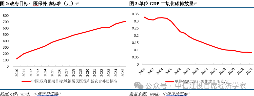 綠色低碳方面,“十四五”主目標寫的是單位 GDP 能耗和二氧化碳排放分別降低 13.5%、18%;2026 年報告則把綠色目標集中寫爲單位 GDP 二氧化碳排放累計降低 17%。