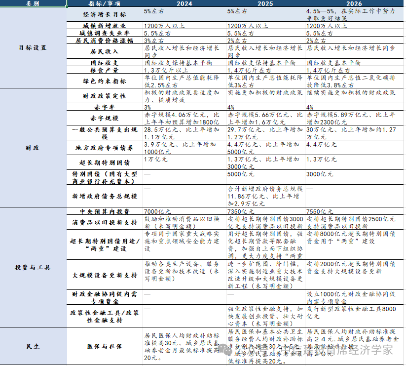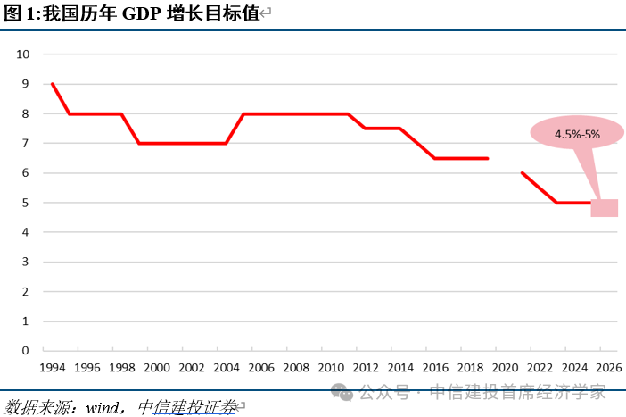 1. 2026年政策取向爲“穩中求進、提質增效”,在延續近兩年主線的基礎上,更加強調“穩”字當頭。GDP增速目標爲4.5%—5%,既保留了增長導向,也把政策重心進一步轉向結構優化和風險化解。