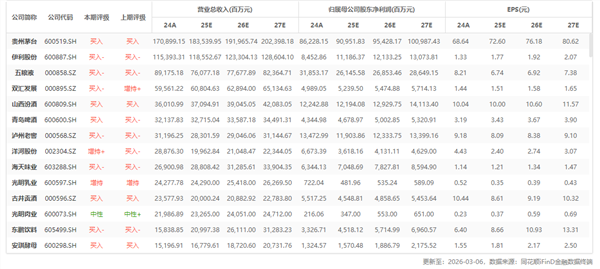 行業重點公司最新盈利預測綜合值