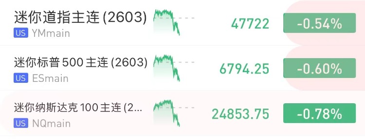 2月非農數據即將公佈!美股三大期指盤前走低,納指期貨 $NQmain 跌0.78%,標普500期貨 $ESmain 跌0.60%,道指期貨 $YMmain 跌0.54%