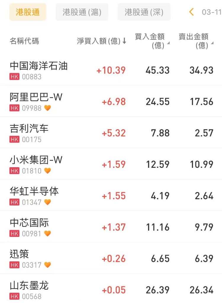 中國海洋石油、阿里巴巴-W、吉利汽車分別獲淨買入10.39億港元、6.98億港元、5.32億港元;