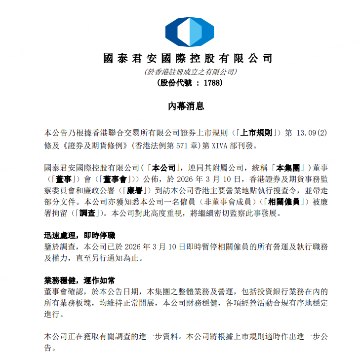 國泰君安國際(01788)公佈,香港證監會和廉政公署3月10日到訪公司香港主要營業地點執行搜查令,並帶走部分文件;一名非董事會成員的僱員被廉署拘留。公司對此高度重視,將繼續密切監察此事發展。