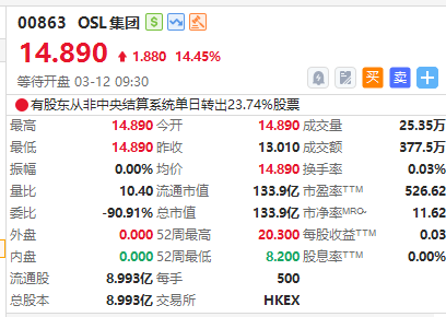 OSL集團高開逾14%,截至發稿,漲14.45%,報14.89港元,成交額377.5萬港元。