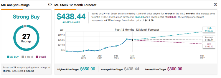據TipRanks最新數據顯示,基於27位華爾街分析師在過去三個月內對美光提出的12個月目標價格,平均目標價爲438.44美元 ,最高預測爲650美元 ,最低預測爲300美元。