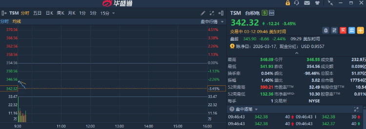 華盛資訊3月12日訊,美股半導體板塊下挫,臺積電跌超3%,英特爾跌近3%,AMD $AMD 跌近2%,英偉達跌超1%。