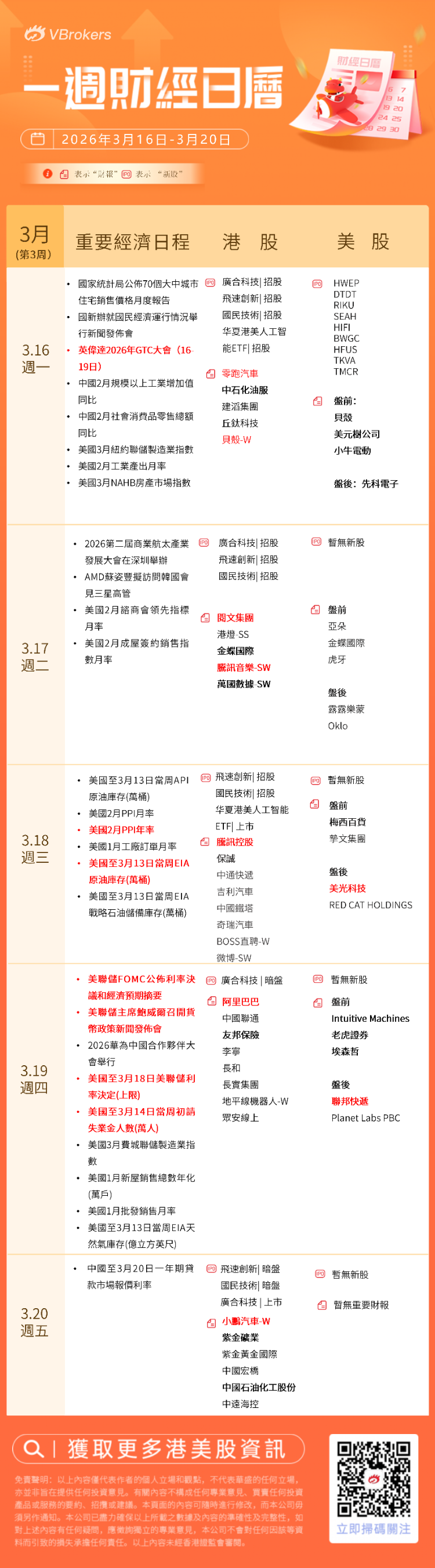 財報方面,港股進入財報密集發佈期,不僅有騰訊、阿里等科技巨頭,也有小鵬汽車、吉利汽車等汽車股,更有紫金礦業、中國宏橋、中國石油化工股份等資源股,投資者可密切關注。