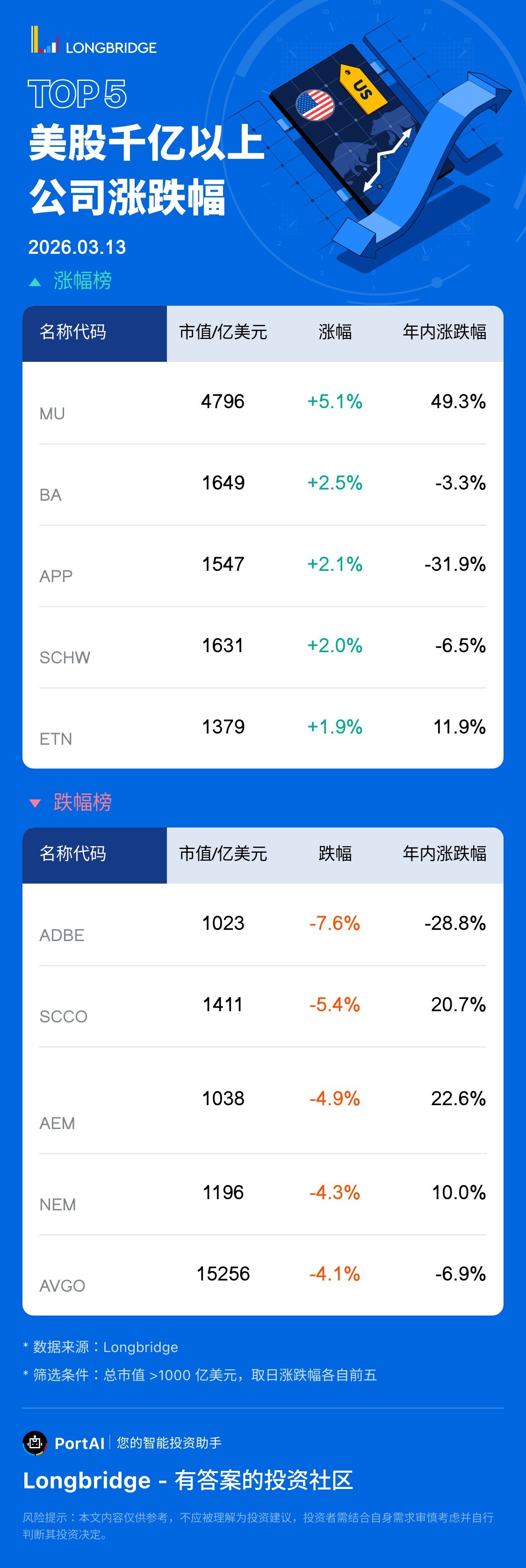 美光科技 (MU) 漲 5.13%,成交額 165.3 億美元,年內累計漲 49.3%。